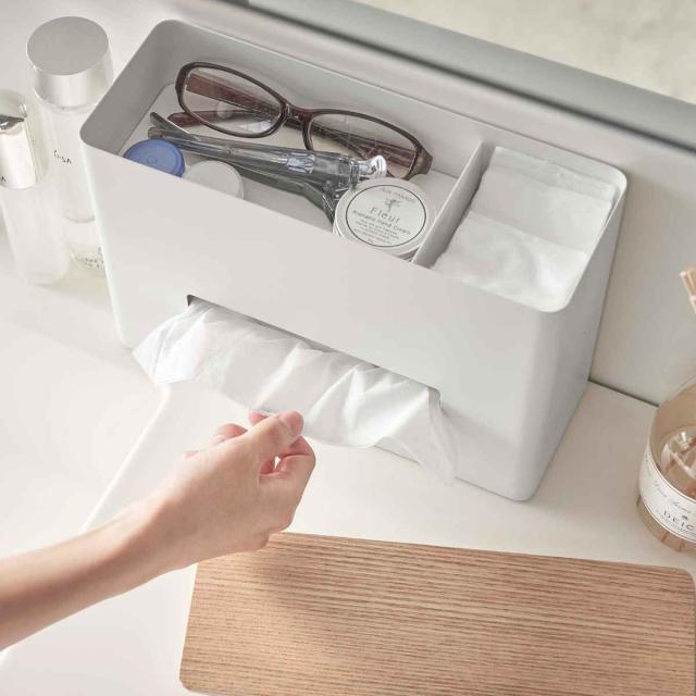 食卓でよく使うティッシュとウェットシートをまとめて収納できるので、リビングやダイニングテーブルで大活躍します。上段はウェットシートや小物類が見えずにスッキリと収まります。中身が見えないのでお部屋の雰囲気も壊しません。