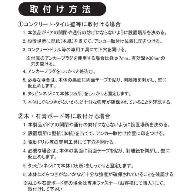 | 備考 | 取り付けに必要な道具:電動ドリル、+ドライバー セット内容:本体、ガイドレール、両面テープ、アンカープラグ、タッピンネジ |