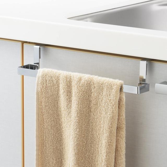 シンク扉に引っ掛けるだけで簡単に設置できるタオル掛けです。キッチンだけでなく、洗面所でも使えます。
