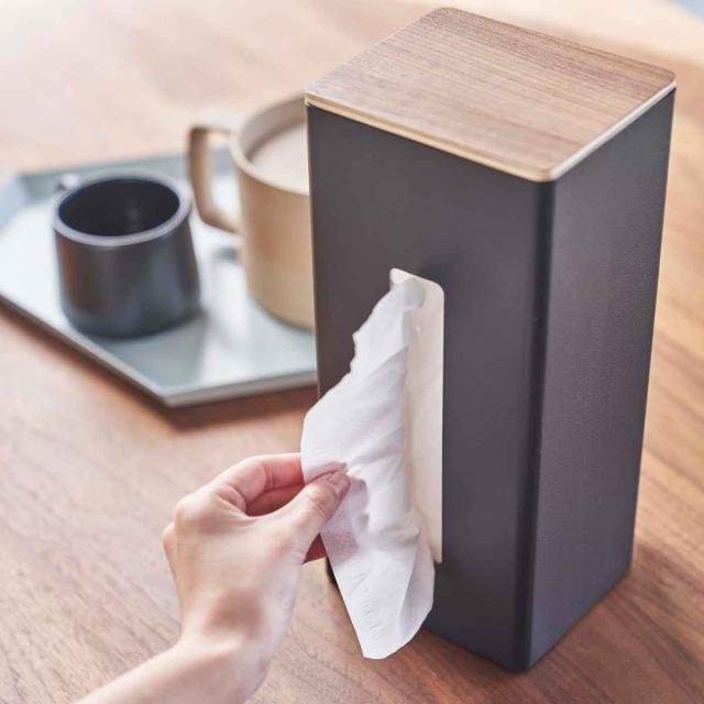 仕切りはマグネット付きで自由に調節することができるので、ソフトパックなどのペーパーが少なくなってきても快適にお使いいただけます。重量も約 1.45kgと重さがあるので、片手でティッシュを取ってもケースが動かずストレスフリーです。また本体の底に滑り止めが付いているので接地面に傷を付ける心配がありません。木製の蓋を外して、お好みの位置に調節して上から入れるだけなので使い方も簡単です。
