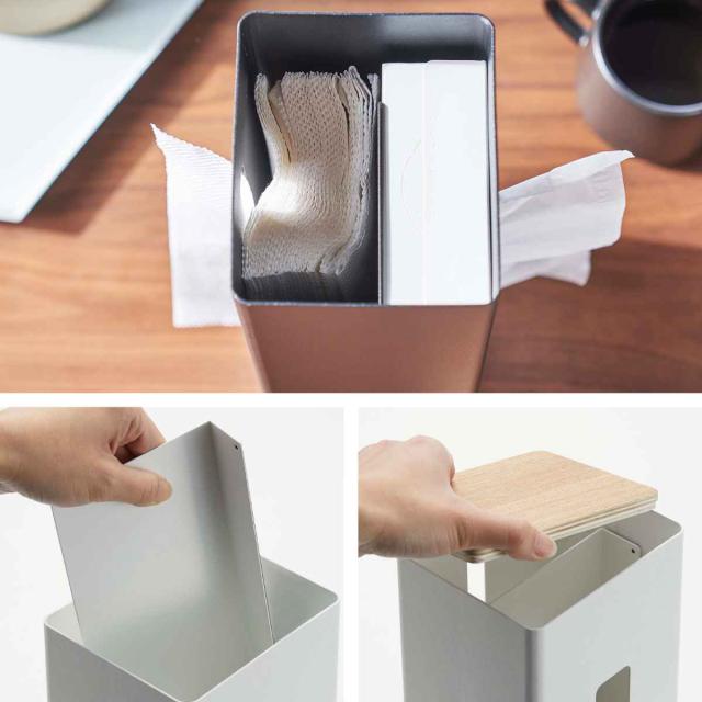 厚型ティッシュボックス・ペーパータオル・ソフトティッシュ・ティッシュペーパーに対応しており、用途に合わせた使い方ができます。仕切りがあるので、ポリ袋の使用もできます。