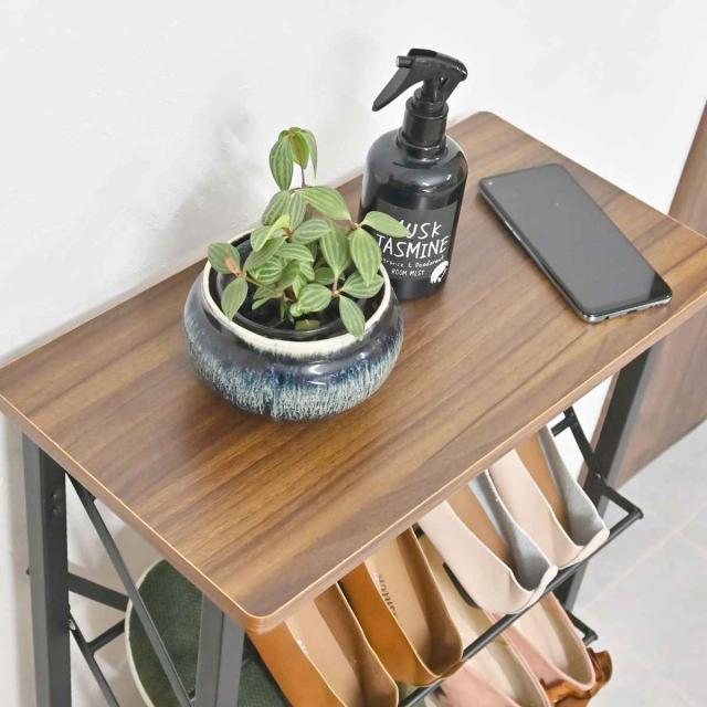 天板は鍵やアルコール消毒液など、小物を置くスペースとして玄関先の整頓に役立ちます。耐久性、耐水性に優れたPVC貼りなので、水や汚れが付いてもサッと拭き取るだけでお手入れが簡単です。側面まで木目調を施しています。