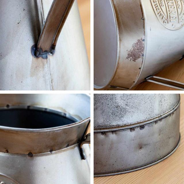 この商品はアンティーク調仕上げとなっております。凹み、サビや塗装が剥がれたように見える箇所があるのは加工であり、製品の不具合ではございませんのでご了承ください。溶接部分においても焼け跡に見える箇所がございますが、アンティーク調の加工によるものですのでご了承ください。