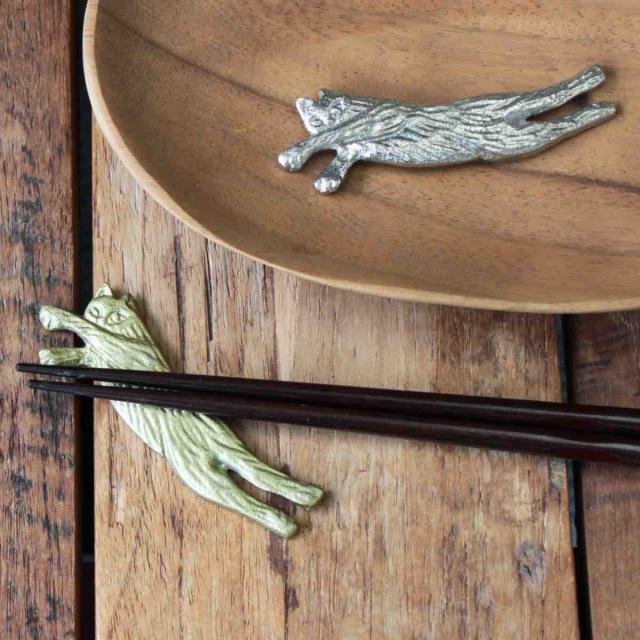 伸びをしているネコをモチーフにした箸置きです。少し大き目なので、スプーンやフォークも置くことができます。くつろぐネコちゃんの姿がなんとも癒されるアイテムです。