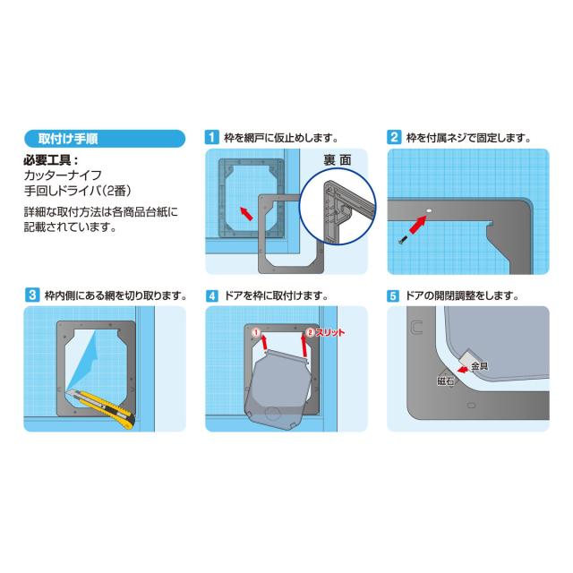 ●ネジで簡単に取付けられる網戸専用のペットドアです。