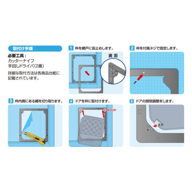 ●ネジで簡単に取付けられる網戸専用のペットドアです。