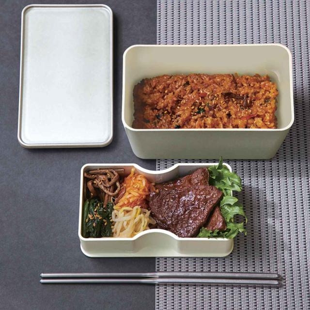 料理に合わせてお皿を選ぶようにお弁当箱の蓋と本体を選べるコレトシリーズの2段角型の本体です。アルミのようなシルバーな下段とシンプルなホワイトの中容器の2段式です。プラスチック素材なので割れにくく、お弁当箱としてだけでなく、食卓でも活躍できるアイテムです。容量は男性の方も満足できる870mlです。
