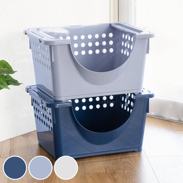 積み重ねも入れ子も可能な前開きバスケットです。収納物を取り出しやすく、よく使う衣類やタオル等の収納に便利です。洗面所でもシンクまわりでも活躍します。
