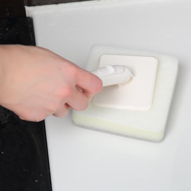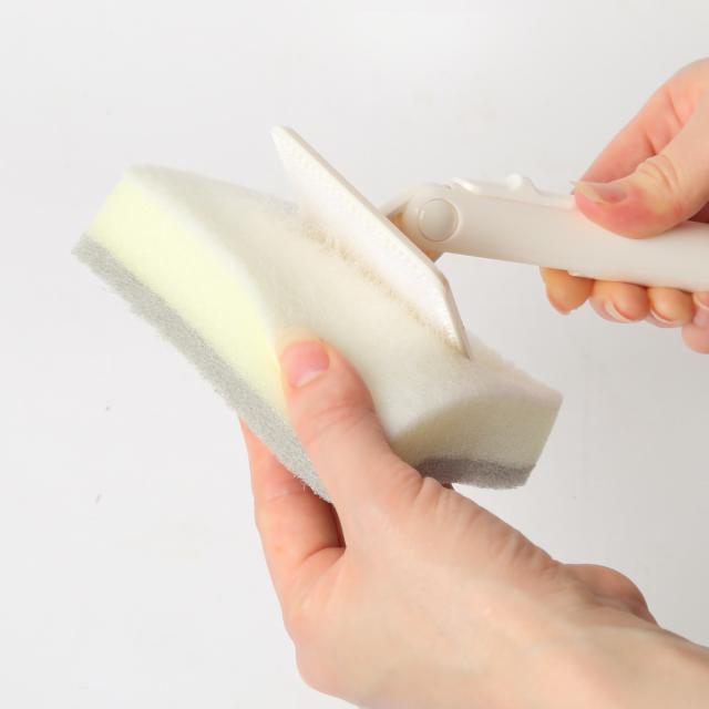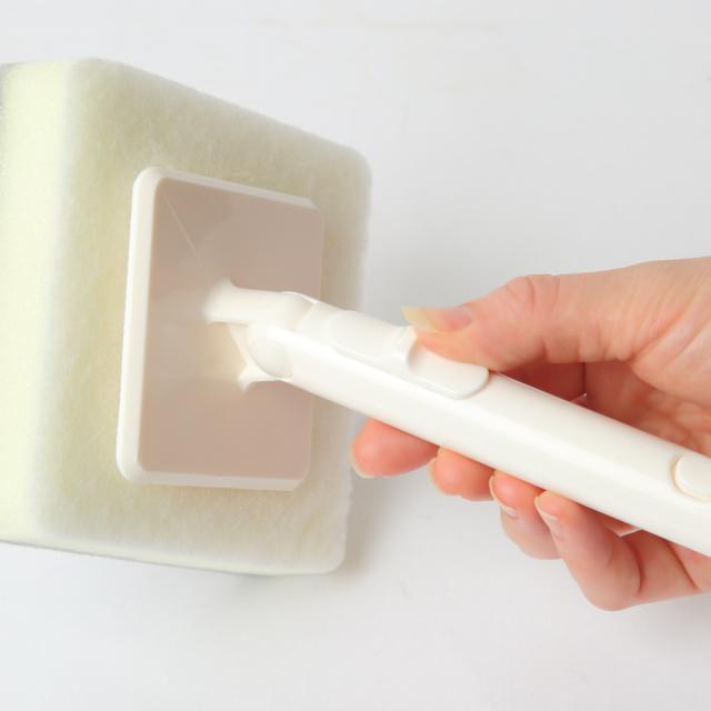 ヘッドはボタンを押して脱着でき、ハンディスポンジとしても使用できます。柄を短く持つと力が入れやすく、浴槽や洗面台をゴシゴシ洗えます。