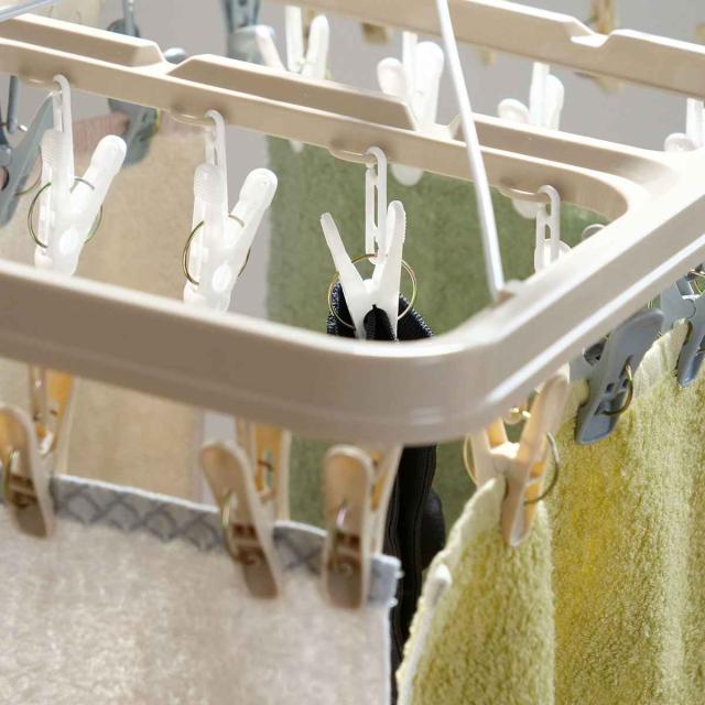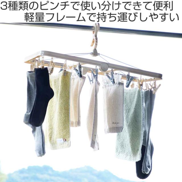 毎日たくさん洗濯をする人にオススメな丈夫で使い勝手が良い、ピンチが32個付いた角ハンガーです。3種類のピンチがとても便利です。