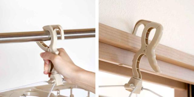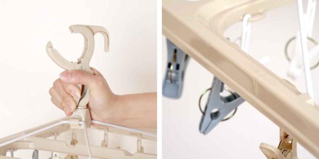 フック部分は、竿やロープに掛けられる「キャップ式フック」と、部屋干しができる「かもいフック」付きです。竿や収納に簡易掛けも可能です。
