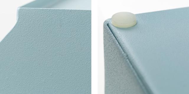 表面はエポキシ樹脂粉体塗装が施されており、ざらりとしたマットな質感となっております。落ち着いた雰囲気で、どんなキッチンにも馴染みます。また、キッチンカウンターのキズ防止・すべり止め用の保護クッションが付属しています。(※お客様自身で取付けて頂きます)