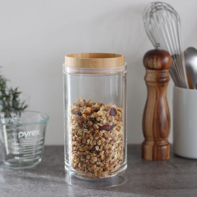 限られたキッチンスペースにスタッキングして収納できる、重なるキャニスターです。バンブー素材でナチュラルな雰囲気の蓋には立ち上がりが付いており、キャニスターの底にぴったりはまります。ぐらぐらせず、安定して積み重ねることが可能です。