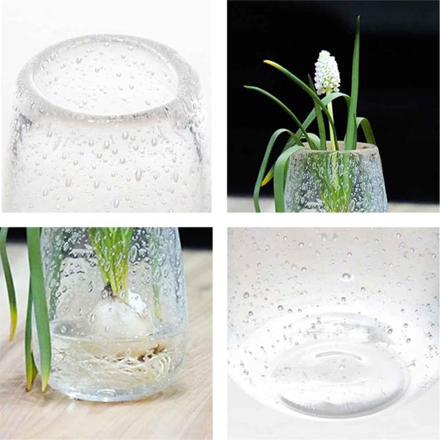 気泡デザインが入ったガラスの花瓶です。どんな植物にも合わせやすく、インテリアともマッチしやすいデザインです。