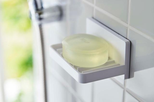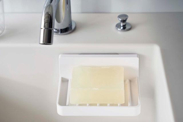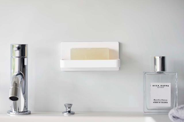 バスルームや洗面台の光沢のある壁面にフィルムフックで取り付ける、ソープトレーです。浮かせて収納できるので、お掃除もしやすくなります。