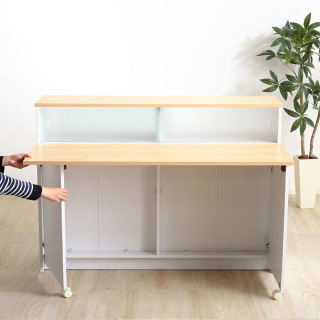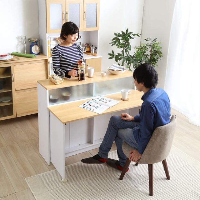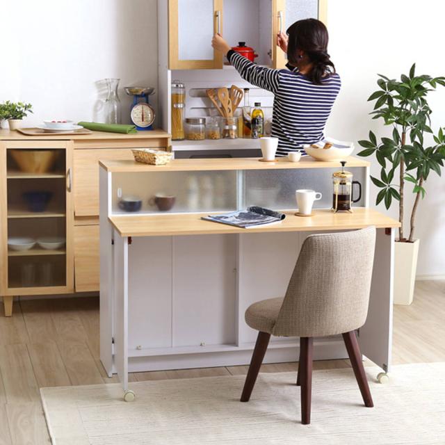 キッチンカウンター 幅120cm 片バタテーブル 間仕切り ガラス戸棚付 ( キッチン カウンター バタフライ 作業台 天板 収納 テーブル キッチン収納 調理台 ラック 折り畳み ナチュラル ブラウン )