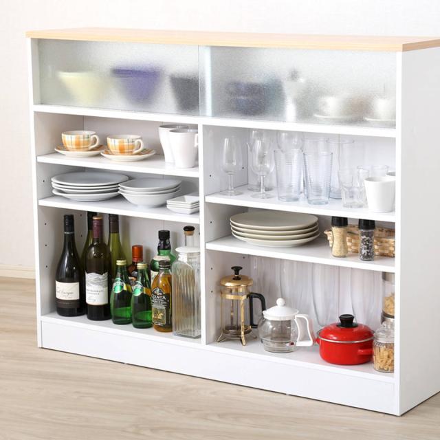 背面の収納棚には、収納したい物に合わせてお好みの高さに調整できる可動棚付きです。ワインボトルや背の高い調味料などの収納にも◎