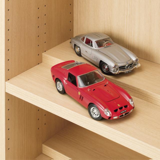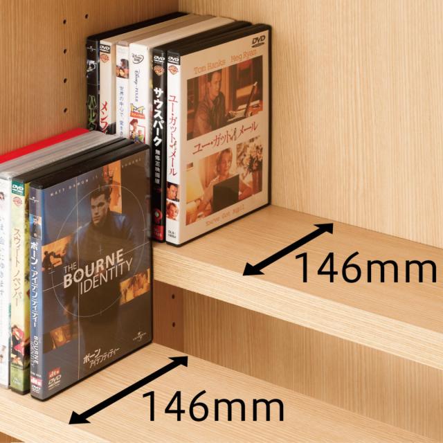前後に分かれた2枚の棚板は、約3cmピッチで可動することができます。前の棚板を1段〜2段下げる事により後に収納した物の背表紙も見え、大量の収納が可能です。