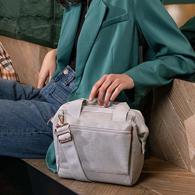 ちょっとしたお出かけの際にはハンドバッグとしても使えます。持ち手は、重ねて持ちやすいように中央部分を細くしています。