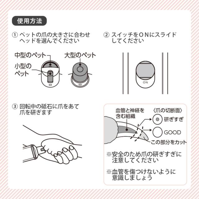 ペットの大きさによって選べる、3種類のヘッド付きです。ヘッドを変えることで小型、中型、大型のペットの爪を研磨できます。