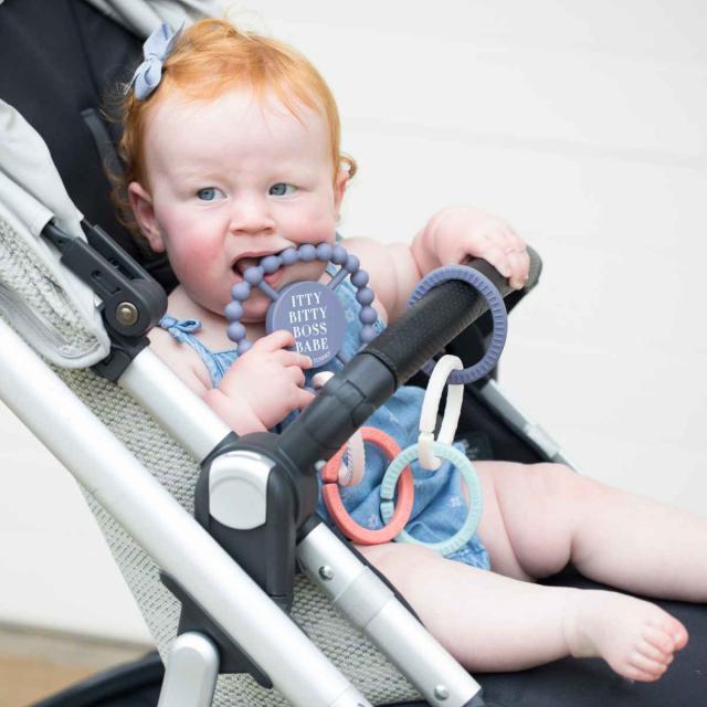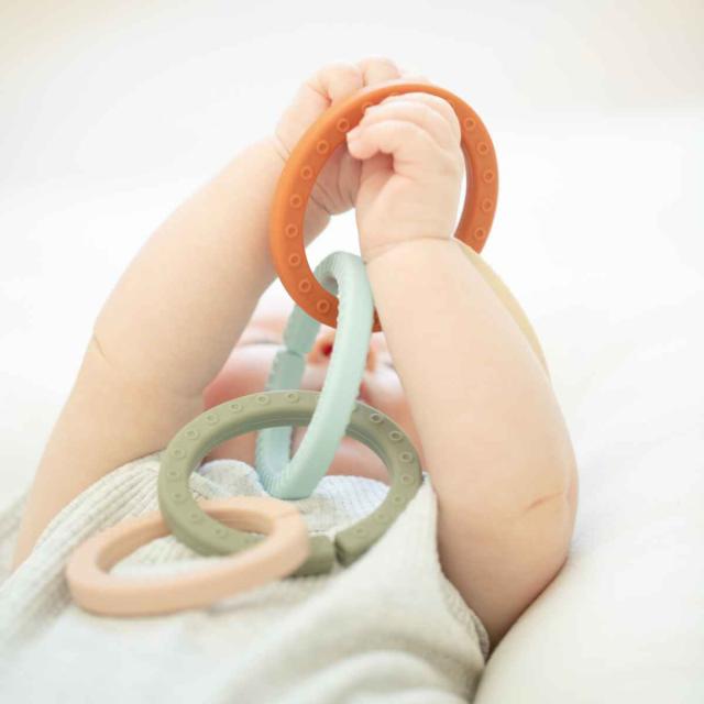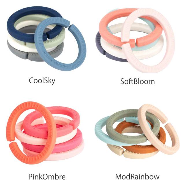 リングを繋げたり、外して単体で遊んだり、歯固めとしてもお使いいただけます。また、ベビーカーやチャイルドシートに取り付け可能なので、どこでも遊ぶことができます。リングの先端に別のおもちゃを繋げても楽しいです。
