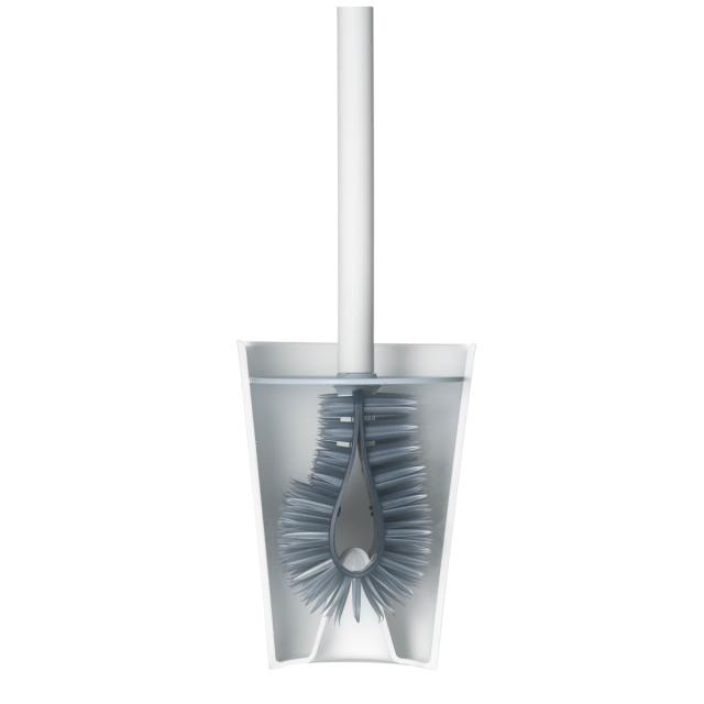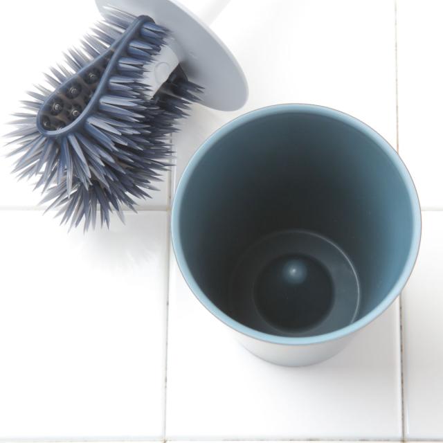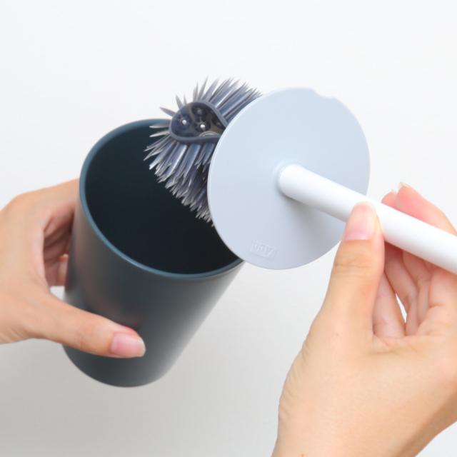ブラシに付いたカバーは掃除の際、水はねを防いでくれます。また収納時にはケースのフタにもなる、見た目と機能性を兼ね備えたデザインです。密閉状態にならないようカバーの一部はカットされています。