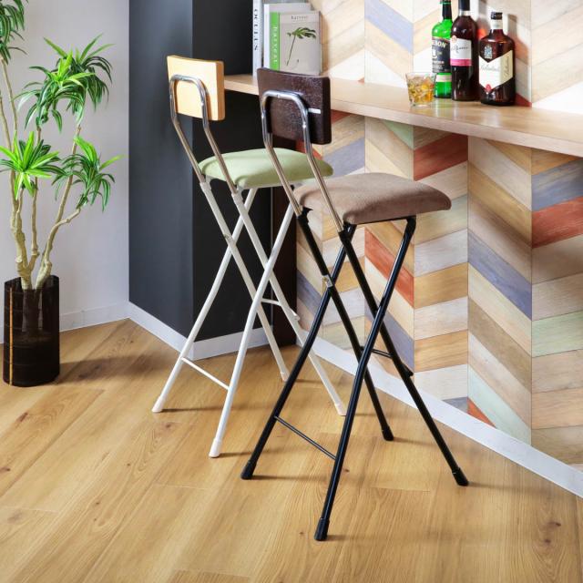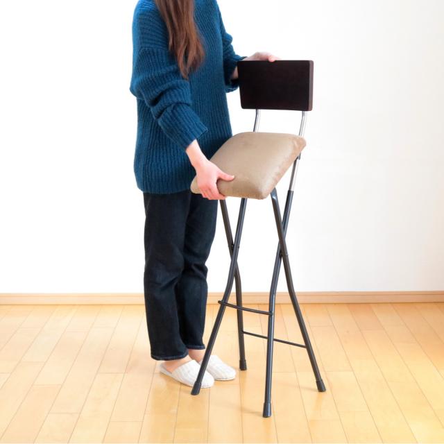 座面高約75cmのチェアは、ハイカウンターテーブルなど少し高めのテーブルに合わせやすく、キッチンのちょっとした腰掛けに使いやすいサイズ感です。折りたたみ可能で使用しない時はコンパクトに収納でき、急な来客時の簡易チェアにもピッタリでとっても便利です。