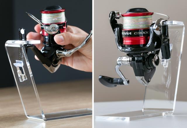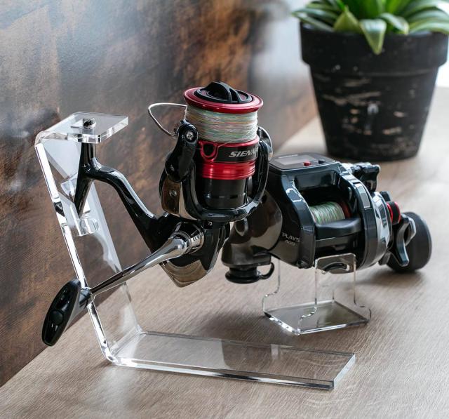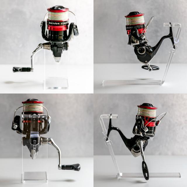 リールスタンドは、ベイトリール用とスピニングリール用の2種類展開しています。お手持ちのリールに合わせてスタンドをお選びいただけます。どちらの種類のスタンドもコンパクトでシンプルなアクリル製スタンドで、リールの魅力を引き立てます。