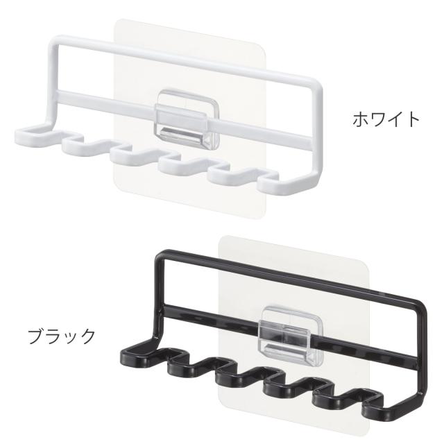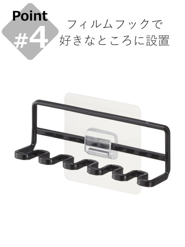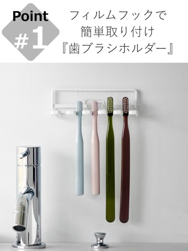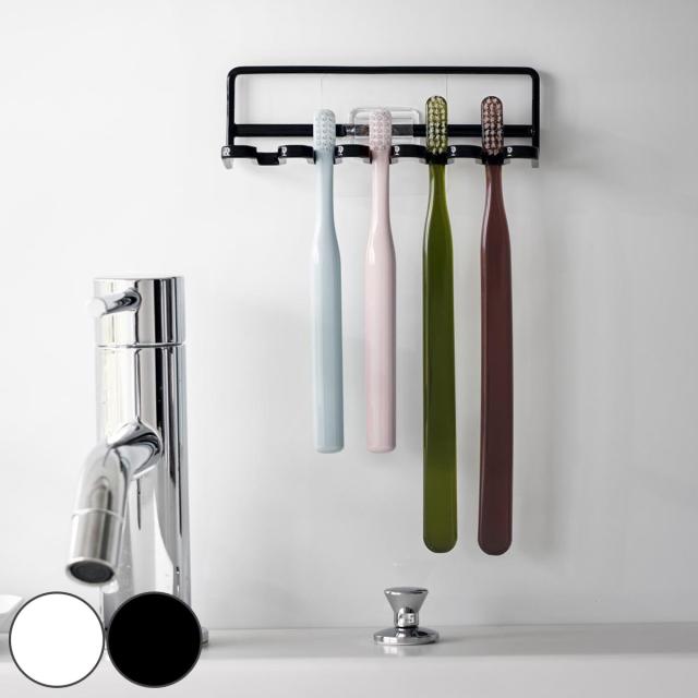 バスルームや洗面台の光沢のある壁面にフィルムフックで取り付ける、歯ブラシホルダーです。最大5本の歯ブラシを収納可能です。浮かせて収納できるので、通気性がよく衛生的です。