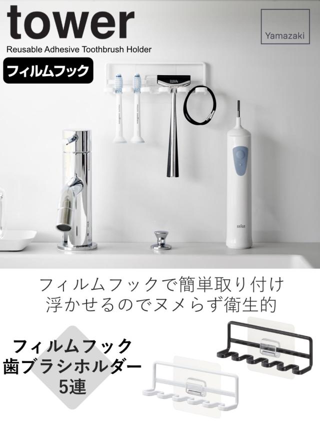 tower 山崎実業 フィルムフック 歯ブラシホルダー タワー 5連 ( タワーシリーズ 歯ブラシスタンド 歯ブラシフック 吸着 フック 掛け 貼って剥がせる 壁面 収納 洗面所 洗面台 風呂 )