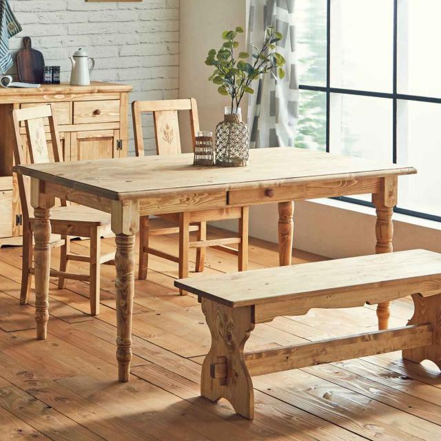 自然に囲まれているような、素朴さとぬくもり感のあるカントリースタイルのダイニングテーブルです。天然木無垢材を使用しているので、使い込むほどに味わい深くなり、温かみのある空間を演出します。4人でゆったり使えるサイズで、料理を置くスペースにもゆとりができます。