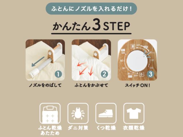 使い方もとても簡単。ノズルを伸ばして布団をかぶせれば、あとはモードを選ぶだけで乾燥がスタートします。複雑な操作は不要なので、どなたでもお気軽にご使用いただけます。