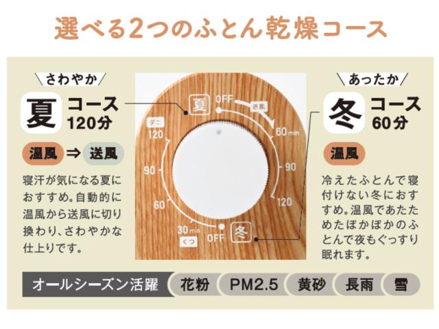 ダイヤルを回すだけで、簡単に季節や天候に合わせた仕上がりを選んでいただけます。寒い時期は「冬コース」で、温風のみのしっかり乾燥に。温かくほかほかの布団でお休み頂けます。また、暑い時期には「夏コース」を選ぶと温風後に自動で送風に切り替わってくれるので、カラっとさわやかな仕上がりになります。