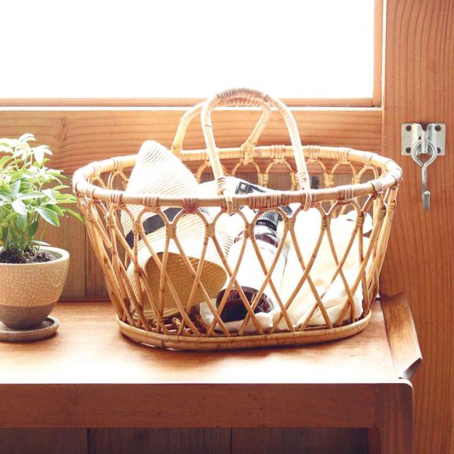 ラタンの強度を活かした曲線が美しいオーバルバスケットです。散らかりがちな小物類をざっくりと収納でき、リビングやキッチンの小物収納や玄関周りのスリッパ収納、ランドリーバスケットとしてもお使いいただけます。ラタンの温もりを感じるどこか懐かしいデザインで、置いておくだけでもインテリアのアクセントになります。