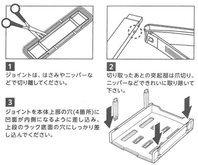 3.ジョイントを本体上部の穴(4箇所)に凹面が内側になるように差し込み、上段のラック底面の穴にしっかり差し込んでください。