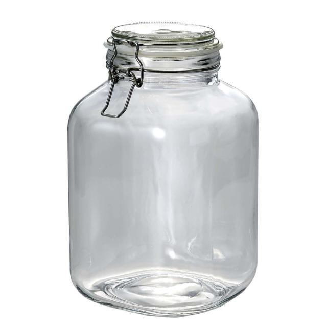 ガラス製保存ビン3Lです。パッキン付きで密閉性が高く、ステンレス製ストッパーでしっかりロック。片手で簡単に開け閉めできます。透明のガラスなので中の様子が一目でわかり、梅酒や果実酒作りに最適です。