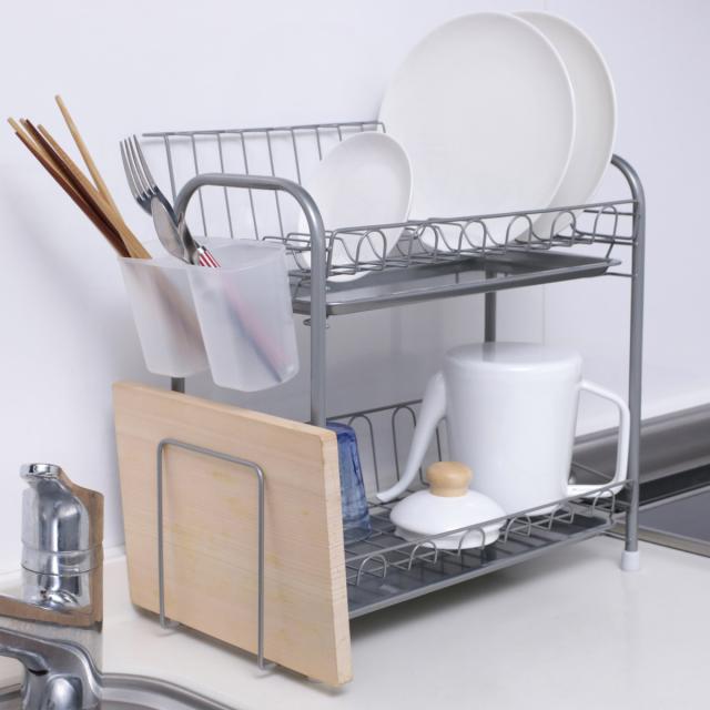 スリムなのに洗い物をスッキリまとめて入れられる2段タイプの水切りラックです。上段には大きなお皿や高さのあるグラス、下段には小皿や茶碗など食器の種類によって置く場所を分けたり、よく使うものは取り出ししやすい上段に置いたりと自由に使い分けができます。