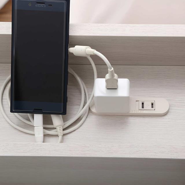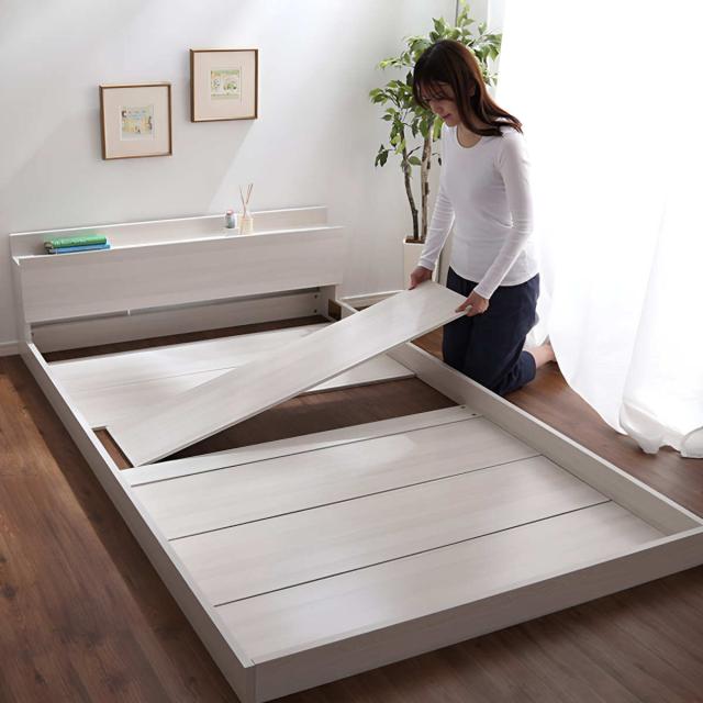 眼鏡や目覚まし時計などの小物を置くことができる宮棚付きです。ホコリが入ることを防止するスライド式の2口コンセントが付いているので、枕元でライトを灯しながら同時にスマホやタブレットを充電することができます。