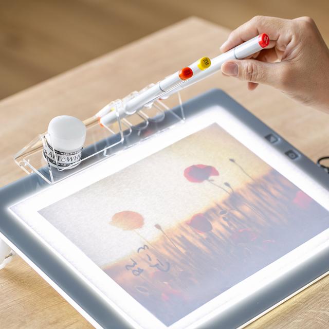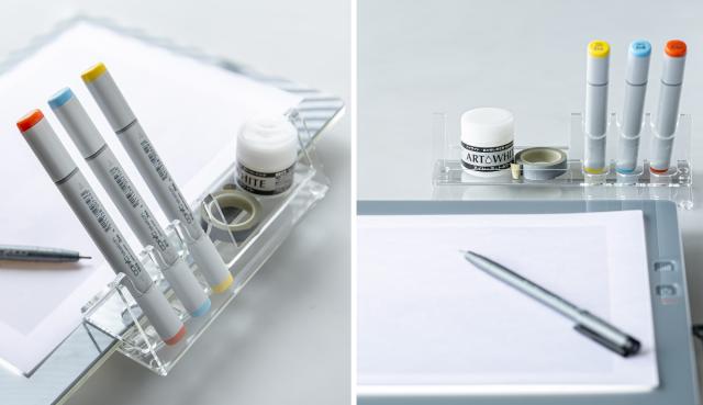 トレース台に取り付けしなくても、平置きしてもペン&トレースタンドは使えます。ペンの向きは斜めにも立てにも挿せるので、使いやすい置き方、ペンの挿し方を選んでお使いいただけます。