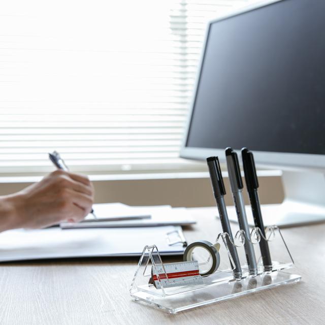 漫画やイラストを描く様の画材道具専用のスタンドとして使えるのはもちろん、一般的なペンや文房具を整理するアイテムとしてもお使いいただけます。デスクでペンを立て、トレー部分にはマスキングテープやハンコなどの小物を入れて使えば、スリムな形状なので場所も取らず、すっきりと整理・収納できます。