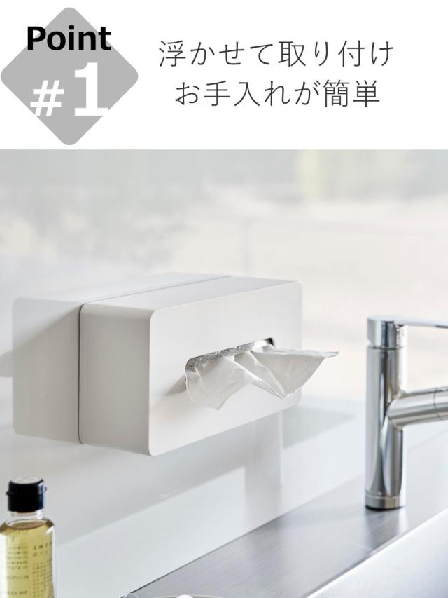 置き場に困ってしまうティッシュを壁面に付けられるティッシュケースです。浮かせて設置できるので洗面台やキッチンのお手入れがスムーズです。