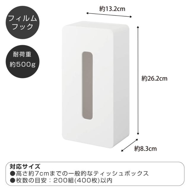 | サイズ | 約 幅26.2×奥行13.2×高さ8.3(cm) フィルムフック接着面:約6×6cm(1つあたり) ※高さ約7cmまでの一般的なティッシュボックスに対応 |