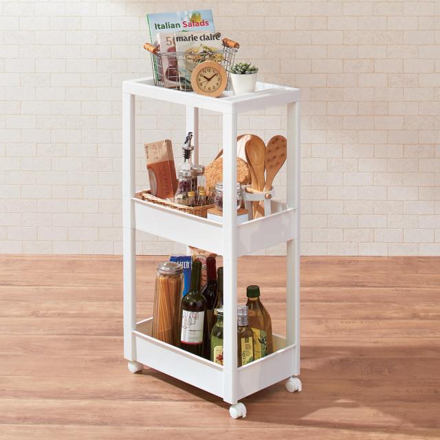 シンプルなフォルムでリビングやキッチン、洗面所、トイレなどの様々な隙間にぴったり使える3段ワゴンです。オープンタイプで取り出しも収納も楽々で、27cmの隙間にぴったり入ります。高さは、洗面台やキッチンの高さに合う85cmでどんな場所でも使いやすい幅と高さになっています。