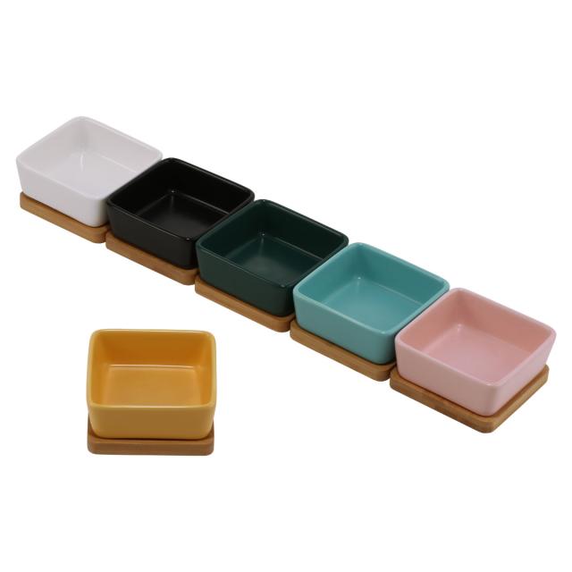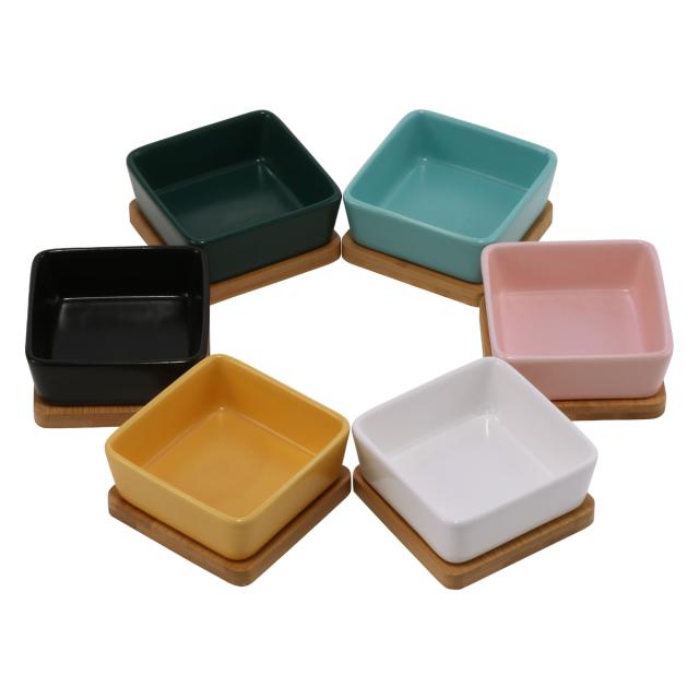 温もりのある色合いの陶器と竹製のトレイがセットになっています。小さなワンちゃんネコちゃん以外にも、うさぎやモルモットなどの小動物にもお使いいただけます。食洗器対応でお手入れが楽です。6色展開なので、お好みのものを選びください。