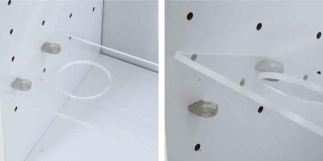 アクリル製のクリアな可動棚は6段階の調整が可能です。棚受けのダボはラバーバンドやリストバンドを飾ったり、キーホルダーかけとしてもご使用いただけます。