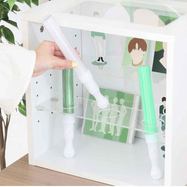 保管場所に困るペンライトを美しく飾りながら収納できます。アクリル製のペンライト立てと、CDや写真などが飾れる棚板が各1枚ずつ付属しています。