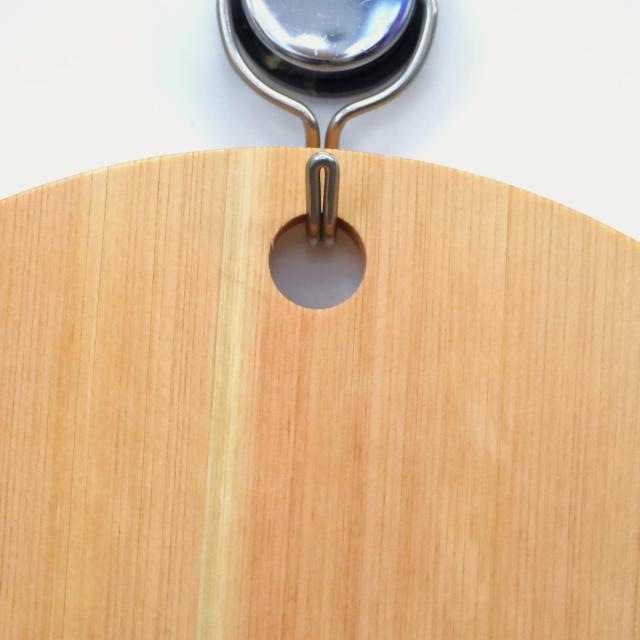 上部の丸穴は収納時のフック掛けはもちろんのこと、指を通せるので切った食材をフライパン等に入れる際にとても便利です。