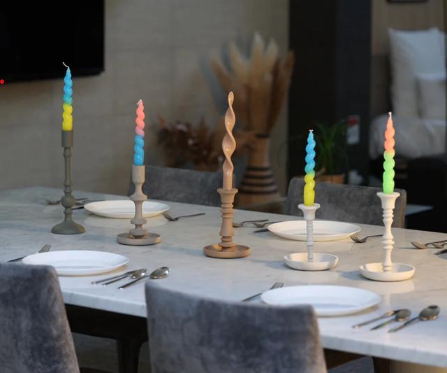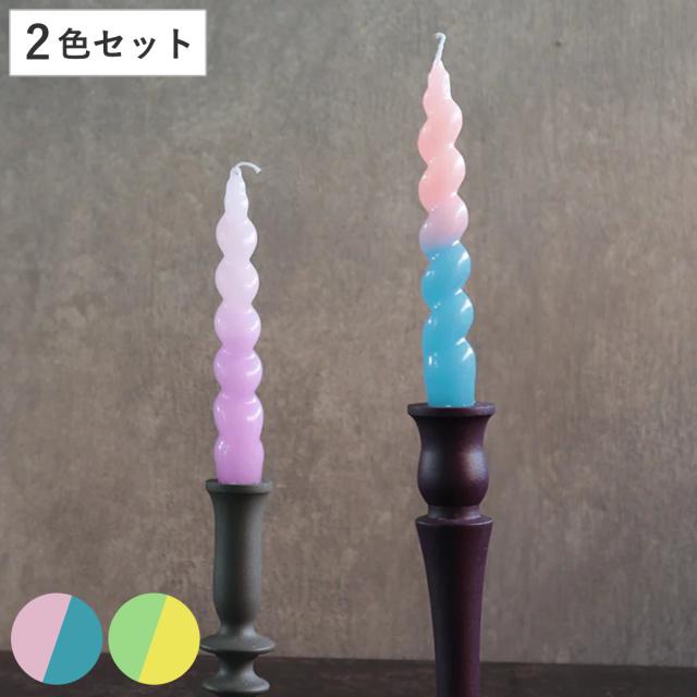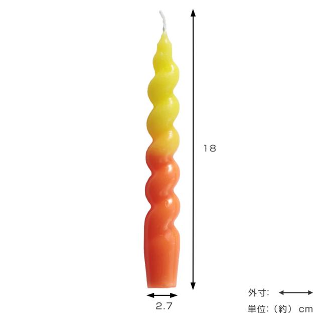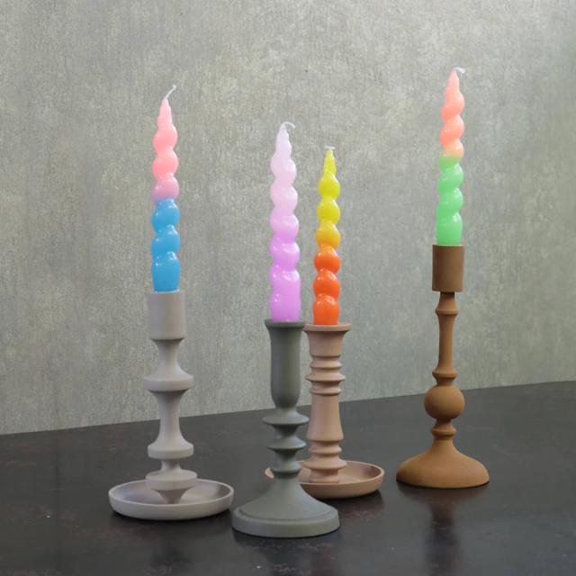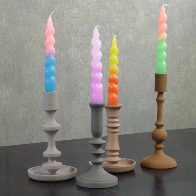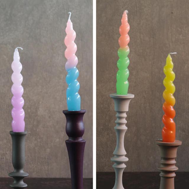 ねじりが特徴のカラフルなテーパーキャンドルです。シンプルなホルダーでも華やかに飾ることができ、火の揺らぎと溶けていく色のグラデーションに癒されます。