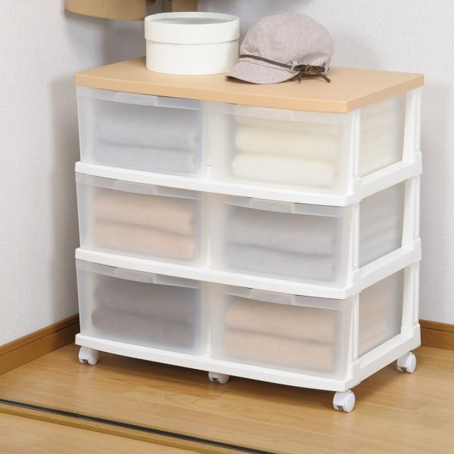 収納ケース エミング 深型ストッカー 木天板 ナチュラル天板 ( 幅69×奥行42×高さ67.5cm クローゼット 収納 3段 6杯 プラスチック 引き出し 日本製 大容量 キャスター付き 押し入れ チェスト 収納ボックス 衣装ケース おもちゃ箱 )