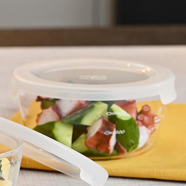 ガラス製の保存容器です。残ったおかずの保存や、作り置きおかずの保存など用途に合わせてお使いいただけます。側面にメモリがついているので、入れた量が分かりやすいです。本体はクリアでシンプルなデザインなので、そのまま食卓に出すこともできます。